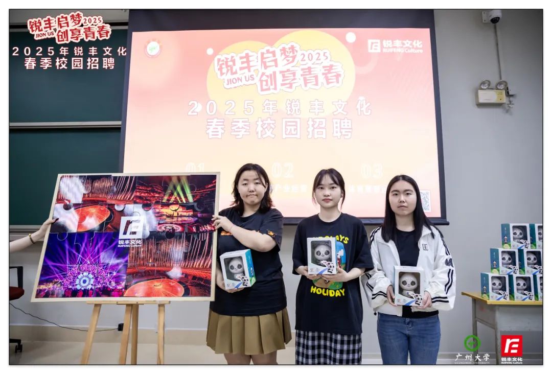 4月,銳豐文化以"青春銳不可當(dāng),豐采無限未來"為主題,聯(lián)動星海音樂學(xué)院、廣州大學(xué)、廣州美術(shù)學(xué)院三所高校,通過多元化的春季校園招聘宣講會,深化校企人才共育模式。聚焦商務(wù)、策劃、品牌等八大核心崗位,創(chuàng)新采用案例分享、沉浸互動等形式,吸引近千名學(xué)子參與,為青年人才搭建職業(yè)成長快車道。